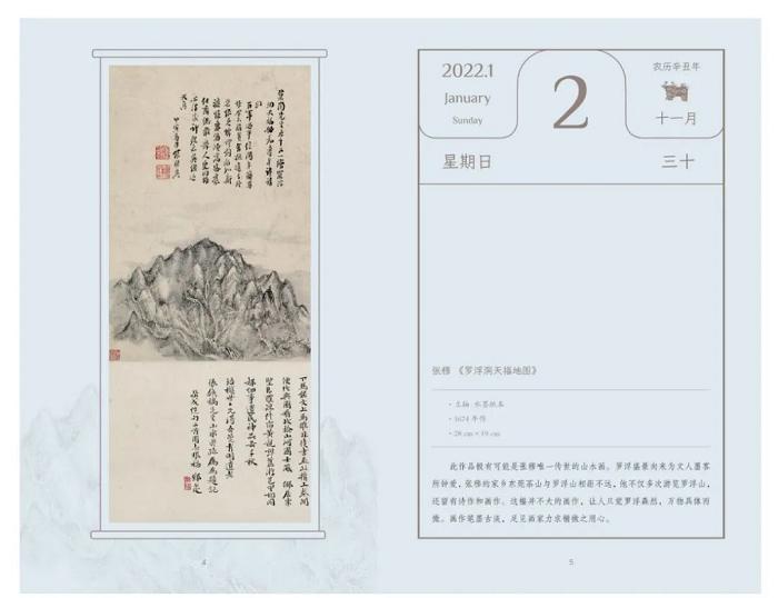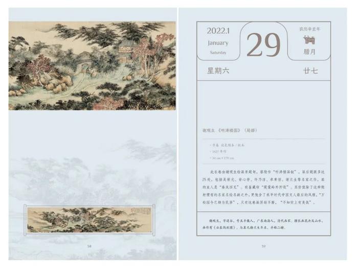 《诗·艺岭南》一面诗画,一面日历设置,让每一页都彰显古典与精致。翻开这样的日历,每一天都是美的享受。日历页上的留白,是设计师特意留给读者的空间,方便我们在时间的流逝里记录日常,定格生活中的点滴。让我们的每个日子,都在诗情画意中感受岭南文化的深厚韵味吧!