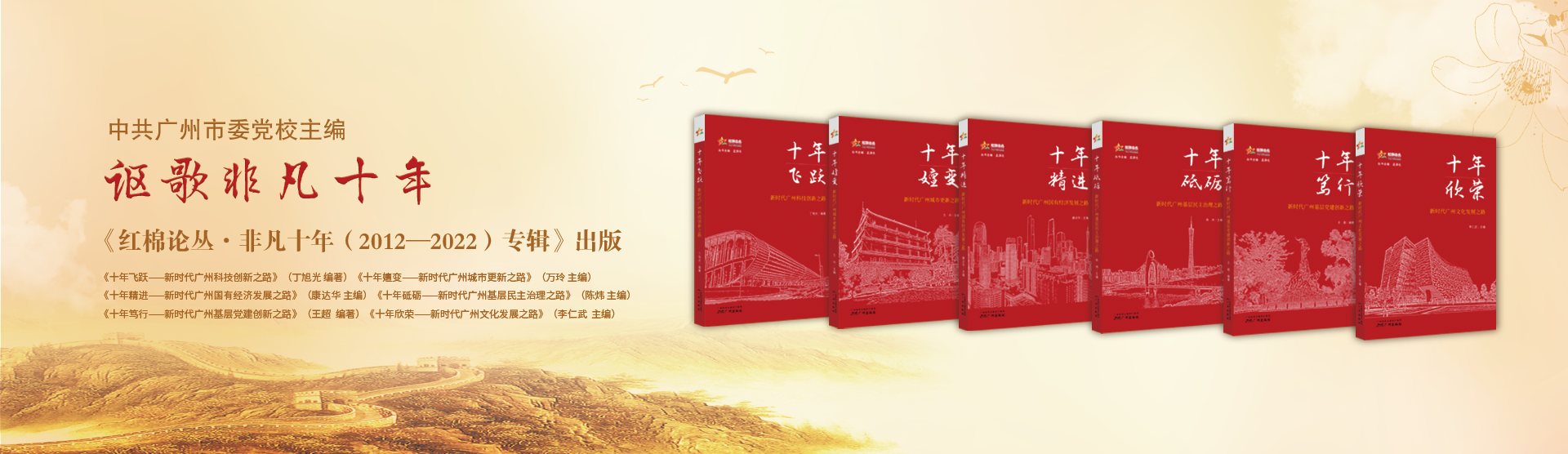 其中,《十年飞跃——新时代广州科技创新之路》全面系统叙述党的十八大以来广州科技创新发展情况,展示了进入新时代广州在习近平总书记关于科技创新重要论述指导下科技创新所取得的巨大成就;《十年嬗变——新时代广州城市更新之路》系统梳理和总结10年来广州城市更新的发展历程、主要做法与成效,展示了广州在习近平总书记关于城市工作重要论述指导下城市发展变化的生动实践;《十年精进——新时代广州国有经济发展之路》梳理总结党的十八大以来广州国有经济的发展成就、道路、经验,展示了新时代广州贯彻落实习近平经济思想所取得的丰硕成果和体现出的责任担当;《十年欣荣——新时代广州文化发展之路》回顾和总结党的十八大以来广州文化建设发展,展示了广州在建设社会主义文化强国城市范例上所进行的积极探索及取得的成效;《十年笃行——新时代广州基层党建创新之路》全面梳理和总结党的十八大以来广州基层党建的探索创新,展示了广州基层党建工作中以群众需求为导向所取得的成效和经验。