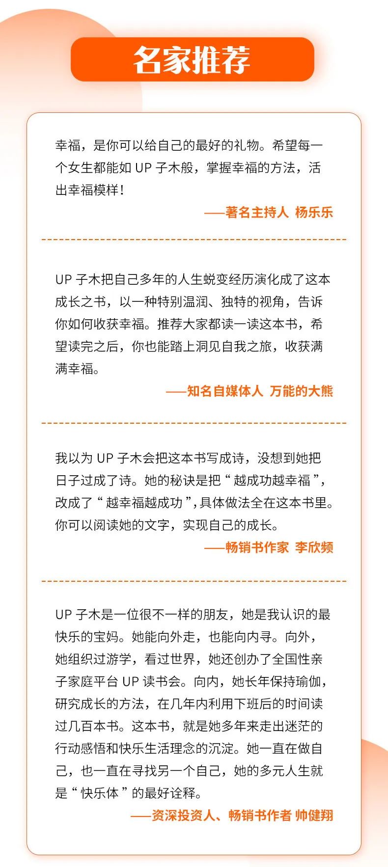 著名主持人杨乐乐、知名自媒体人万能的大熊、畅销书作家李欣频、资深投资人帅健翔都对UP子木的新书给予了高度评价。他们认为,这本书不仅能帮助读者实现自我成长,还能让读者踏上洞见自我之旅,收获满满幸福。