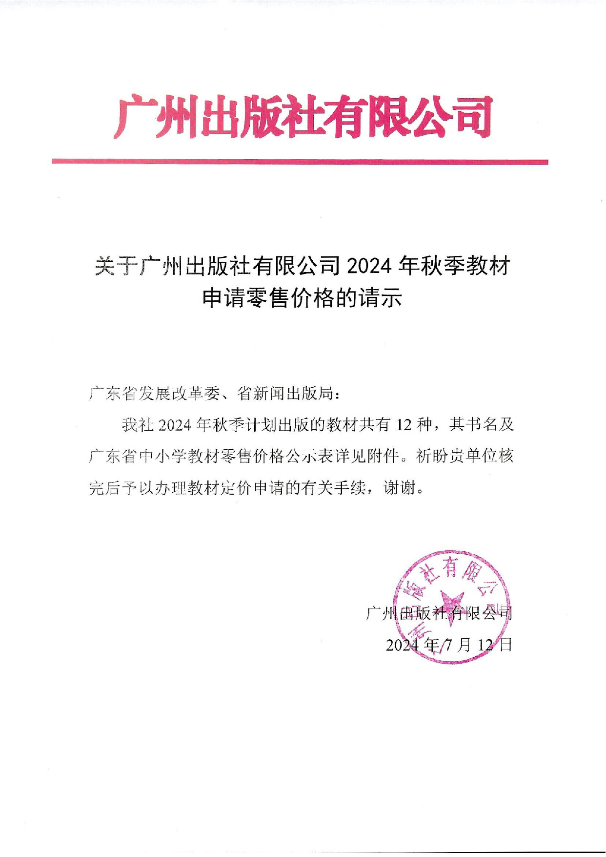 关于米乐网页版入口有限公司2024年秋季教材申请零售价格的请示