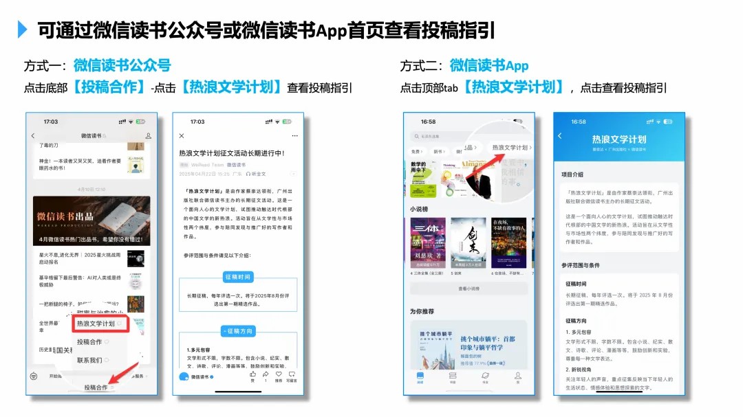此外,也可以通过微信公众号或微信读书APP进行投稿,具体操作指引如下: