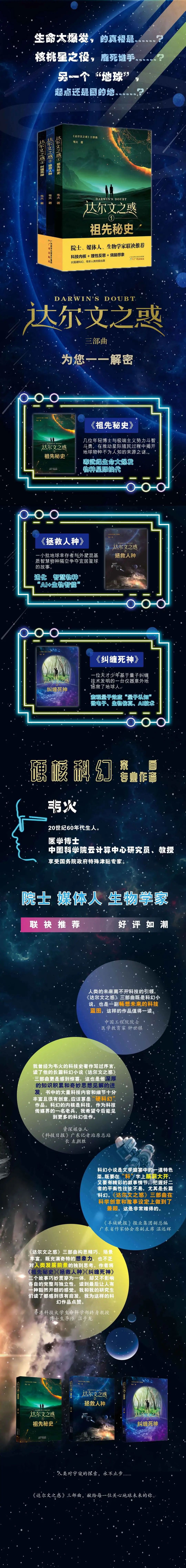 《达尔文之惑》三部曲包括《祖先秘史》《拯救人种》《纠缠死神》,书名的灵感来源于达尔文对5.4亿年前本来循序渐进的生物演化过程突然加快,大量节肢动物、软体动物、腕足动物和环节动物在没有祖先化石的情况下,突兀出现在寒武纪地层中的疑惑。